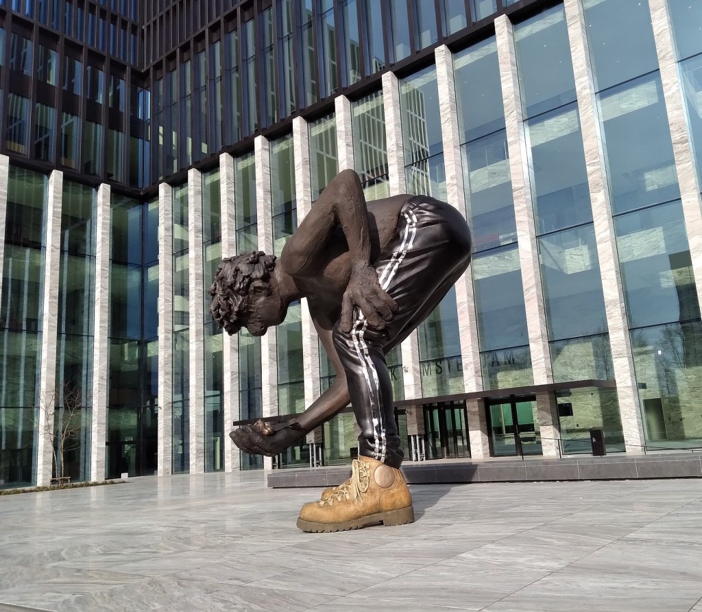 The figure’s posture is deliberately ungainly, knees bent in a half squat, bum in the air, a little extra flesh pressing over the waistband of its adidas tracksuit bottoms, elements that are comically incongruous with the gleaming marble floor of the forecourt and the building’s austere contemporary architecture. In Eisenman’s earlier work, the comic contrast is instead with the dignity and perfection of classical statuary, her installation at the Carnegie Museum of Art in 2013, for example, where the figures interact with the collection of Greek and Roman casts, and ‘Fountain’ (2017), where the group of scruffy figures lounging around a pool contrasts with the classical model of the fountain as a composed and idealised public centrepiece. In ‘Love or Generosity’ the classical exemplar may not be as present, but as a piece of public art the expectations of virtuosity remain, and both the loose modelling of the figure and its general lack of decorum (the semi-squat, its naked top half, the leisure wear) contrasts with the formality of the public space. While the previous giants were unclothed, the decision here to opt for tracksuit bottoms may well have been partly pragmatic – to avoid any fixation on the genitalia (or lack thereof) that would otherwise occupy a central position – but the figure’s half-clothed state still creates the feeling of comfort and ease that is so evident in her other, unselfconsciously naked figures.