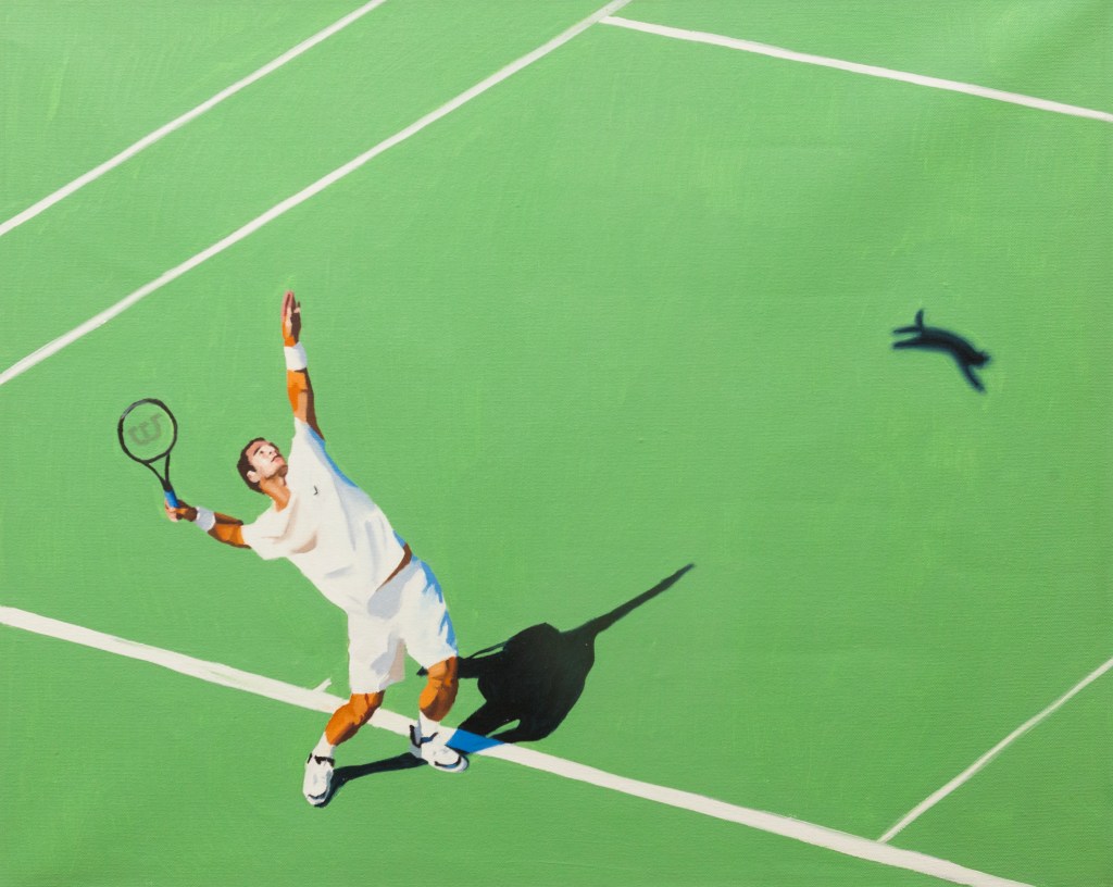 But while the venerated athlete’s body is central to Practice Makes Purrfect, it is also intriguingly dislodged; just one element among many. The properties of the tennis milieu are richly symbolic in terms of the issues raised above (holders of heroic status and embodied expertise) but also rich in terms of formal opportunities. The great sweeps of colour, from cool pastels to the hot intensity of terracotta, for instance, and the dynamism of the white lines bisecting those colours, which create the field anew in each image. The lines create the boundaries for each figure – the field for their action (just as the edges of the painter’s canvas define the visual field), and it’s almost unnerving when we come across an image without lines, the figure unbound and unanchored in space. There’s also the unruly interplay between the shadows: the tug between the conventional interest of the vertical plane and the more obscure action on the horizontal. Even skin colour seems more like tonal experimentation than studied realism. And while Martinez doesn’t seek to deny the celebrity of the individual player, he dials down too vivid a likeness as a way of preventing the dominance of that one aspect, and ensuring the even distribution of attention. This calibration of the visual field is, after all, what painting excels at.